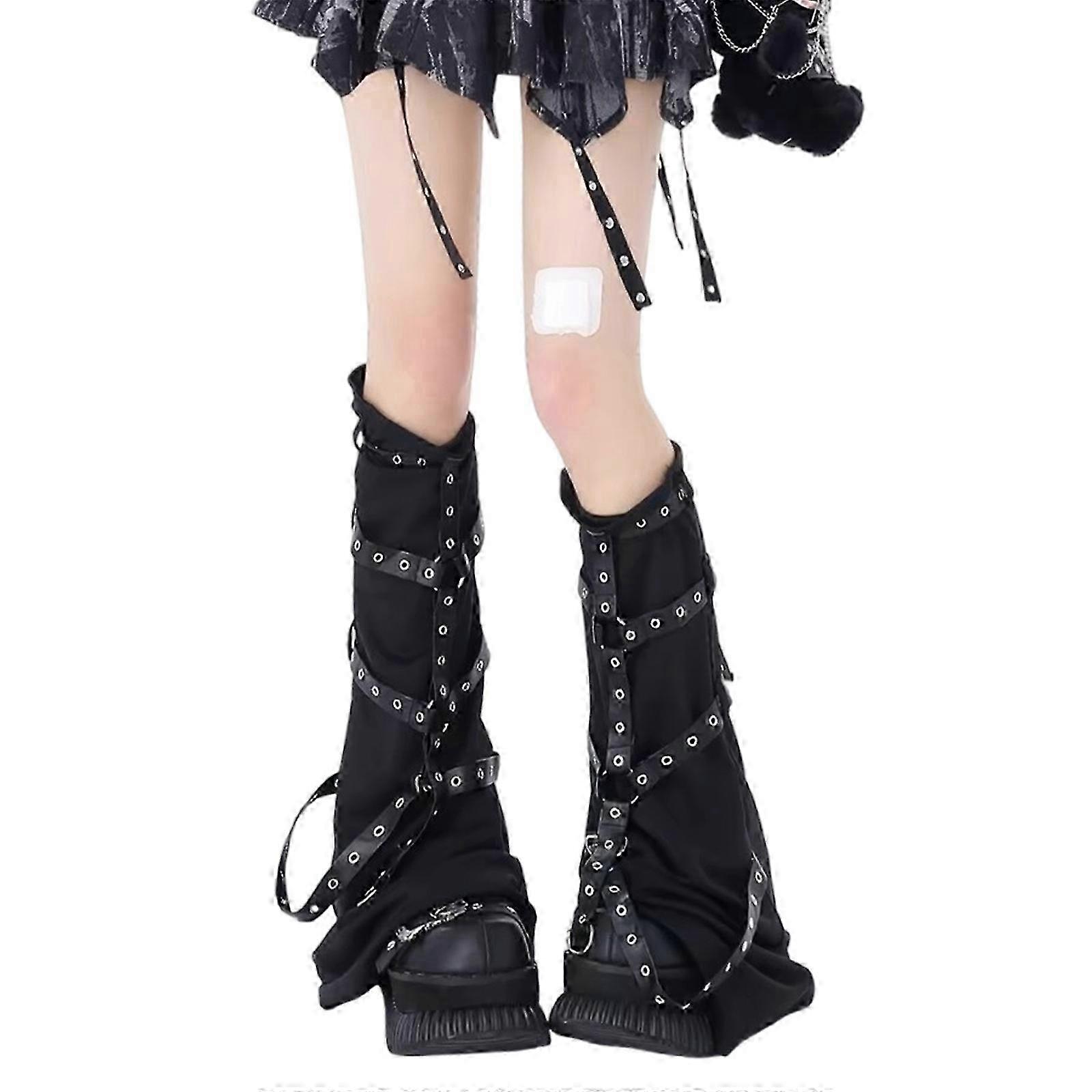 Punk Black Leg Warmer Stockings with Metal Eyelets Leather Strap Harness Leg Cover Flared Stockings Streetwear for Women