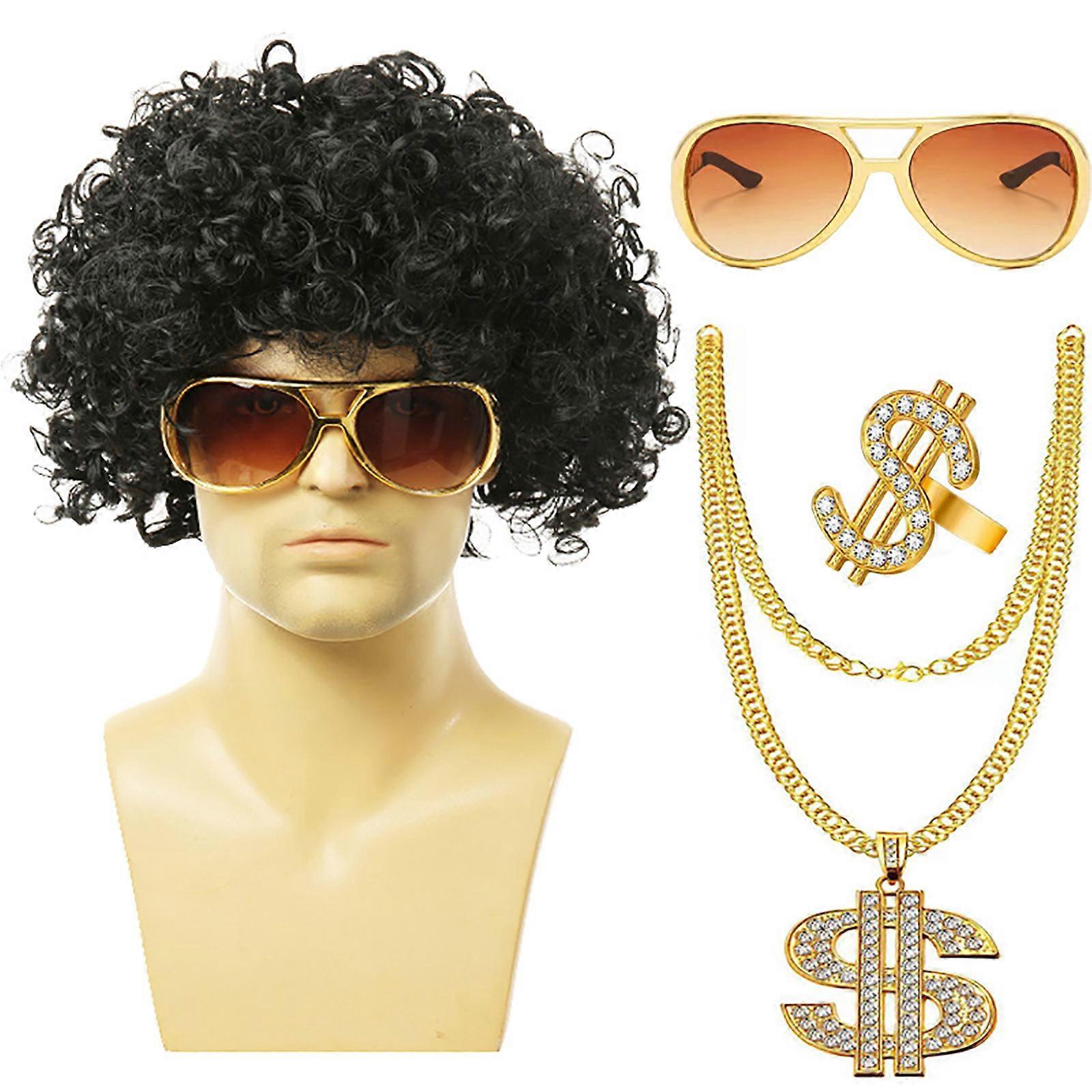 80s Disco Wig Costume Accessories Rocker Wig Set Glasses Necklace Hippie Costume Set Curly Rock Wig for Halloween Party Multicolor