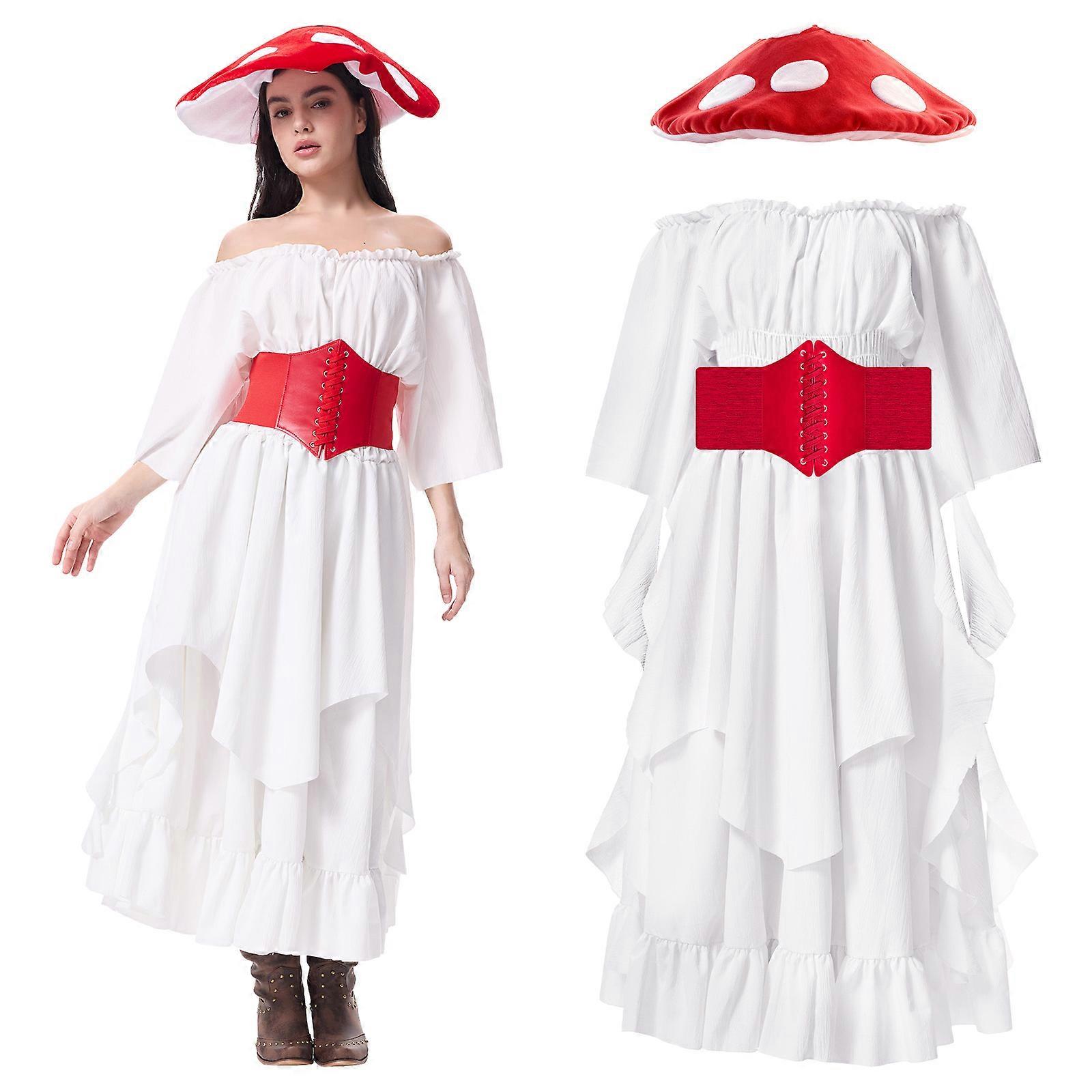 Mushroom Costume Women with Corset Belt Hat Renaissance Medieval Victorian Fairy Retro Vintage Gown for Halloween Cosplay Props