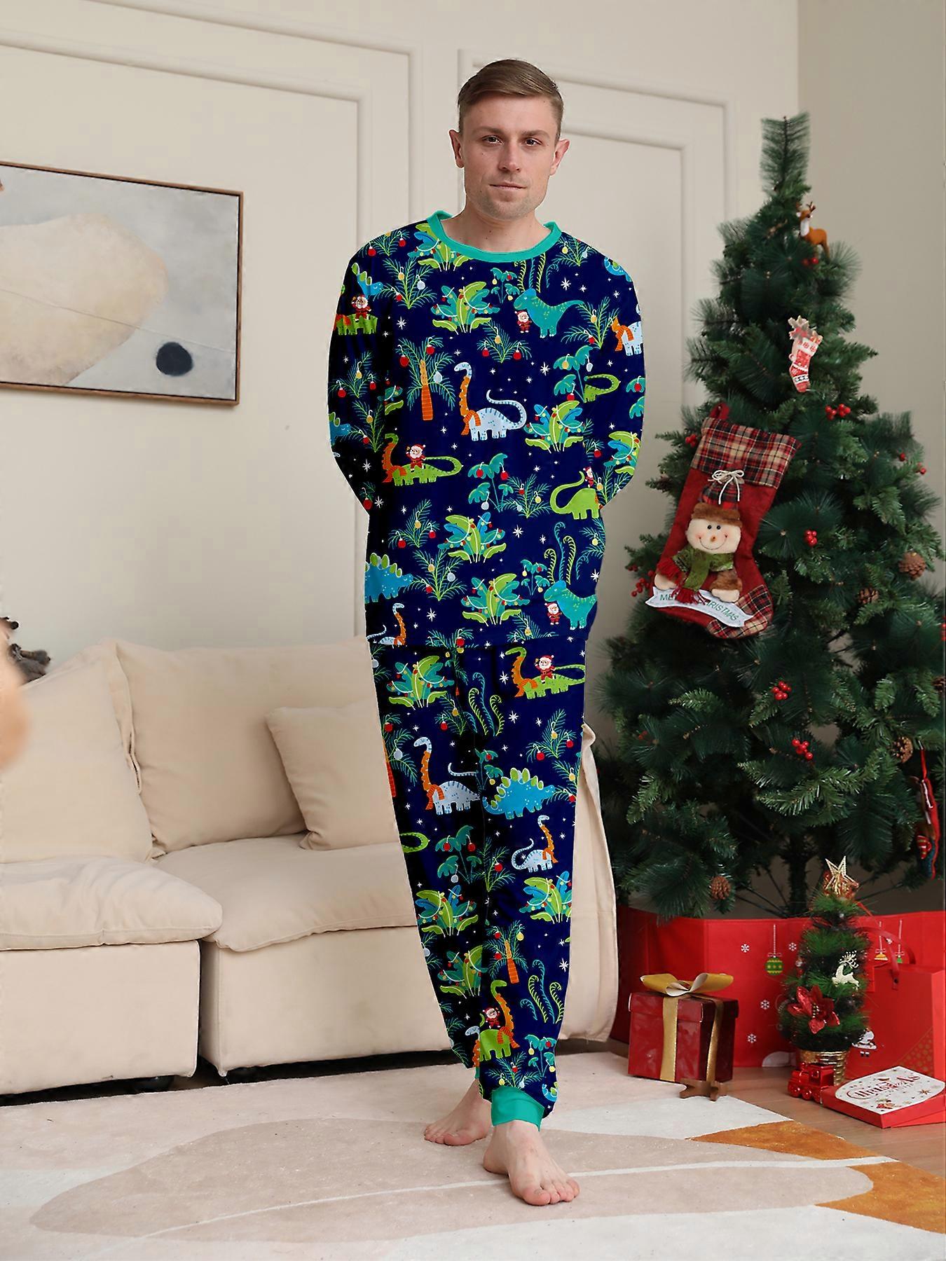 Festive Christmas Couple Pajamas: Navy All - Over Dinosaur Print Sleepwear Set