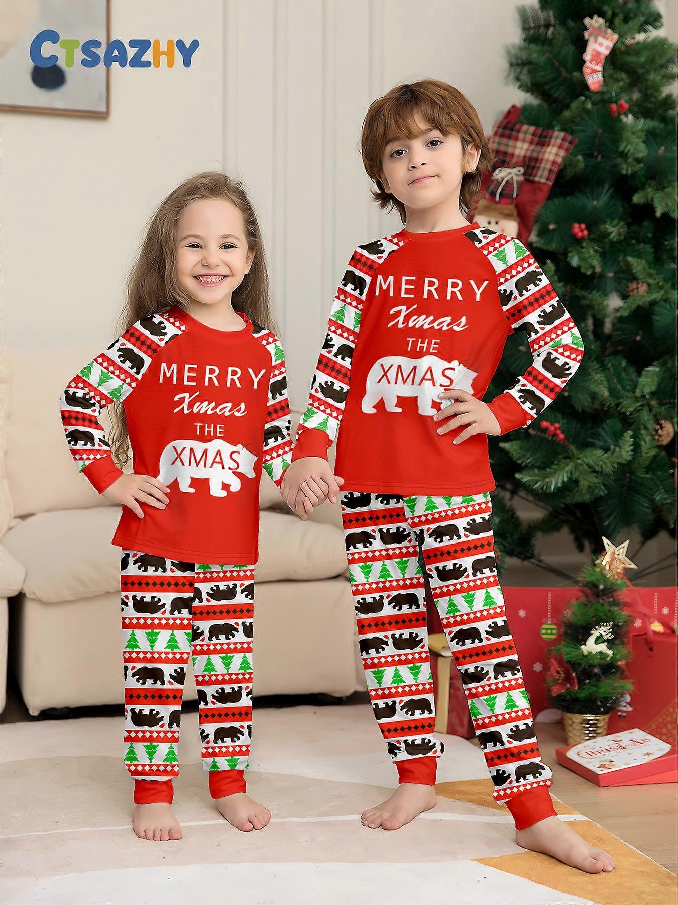 Merry Christmas Kids Casual Matching Pajamas for Boys & Girls, "Merry Xmas" Bear Christmas Tree Raglan Sleeve Red Sleepwear