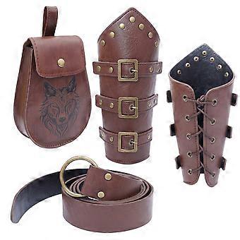 Medieval Leather Arm Bracer with Leather Belt and Leather Waist Pack, Halloween Medieval Costume for Men Cosplay Party Brown style three
