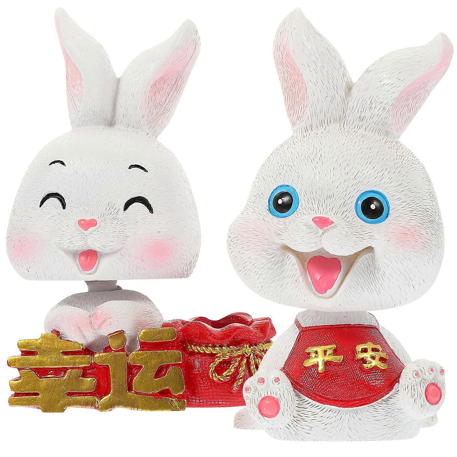Shaking Head Resin Rabbit Figurines 2pcs Cute Bunny Ornament for Car Desktop Garden Decoration Zodiac Animal