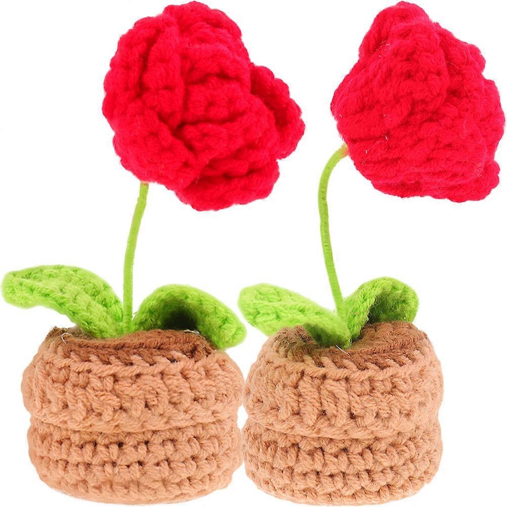 Small Crochet Flowers Potted Rose Flower Office Accessories Decoration DIY Gift 2Pcs