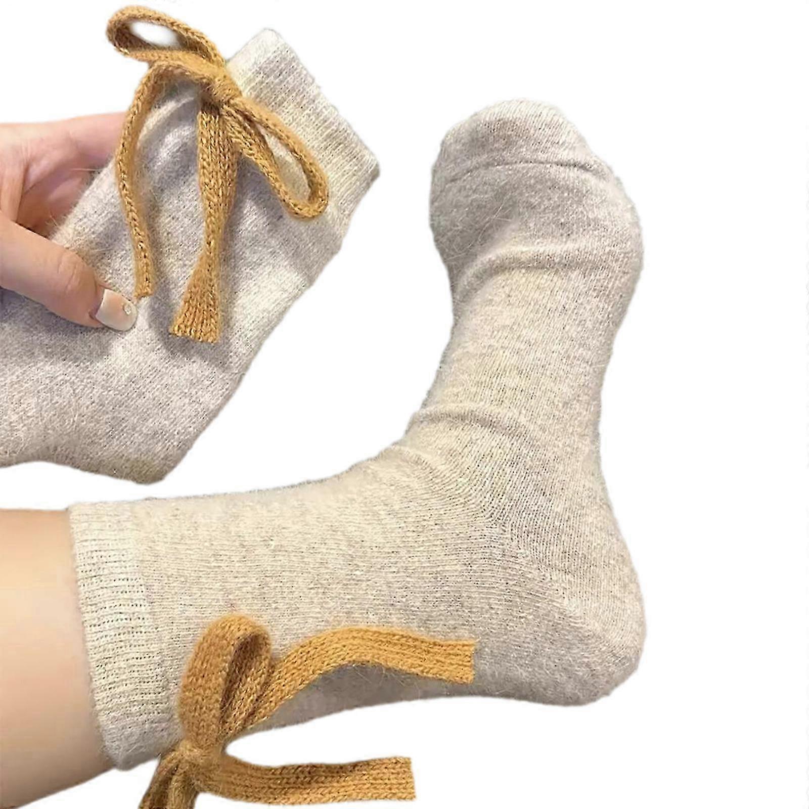 Solid Color Winter Warm Crew Socks with Bowknot Accent for Women Thick Faux Wool Blended Breathable Middle Tube Socks Pink