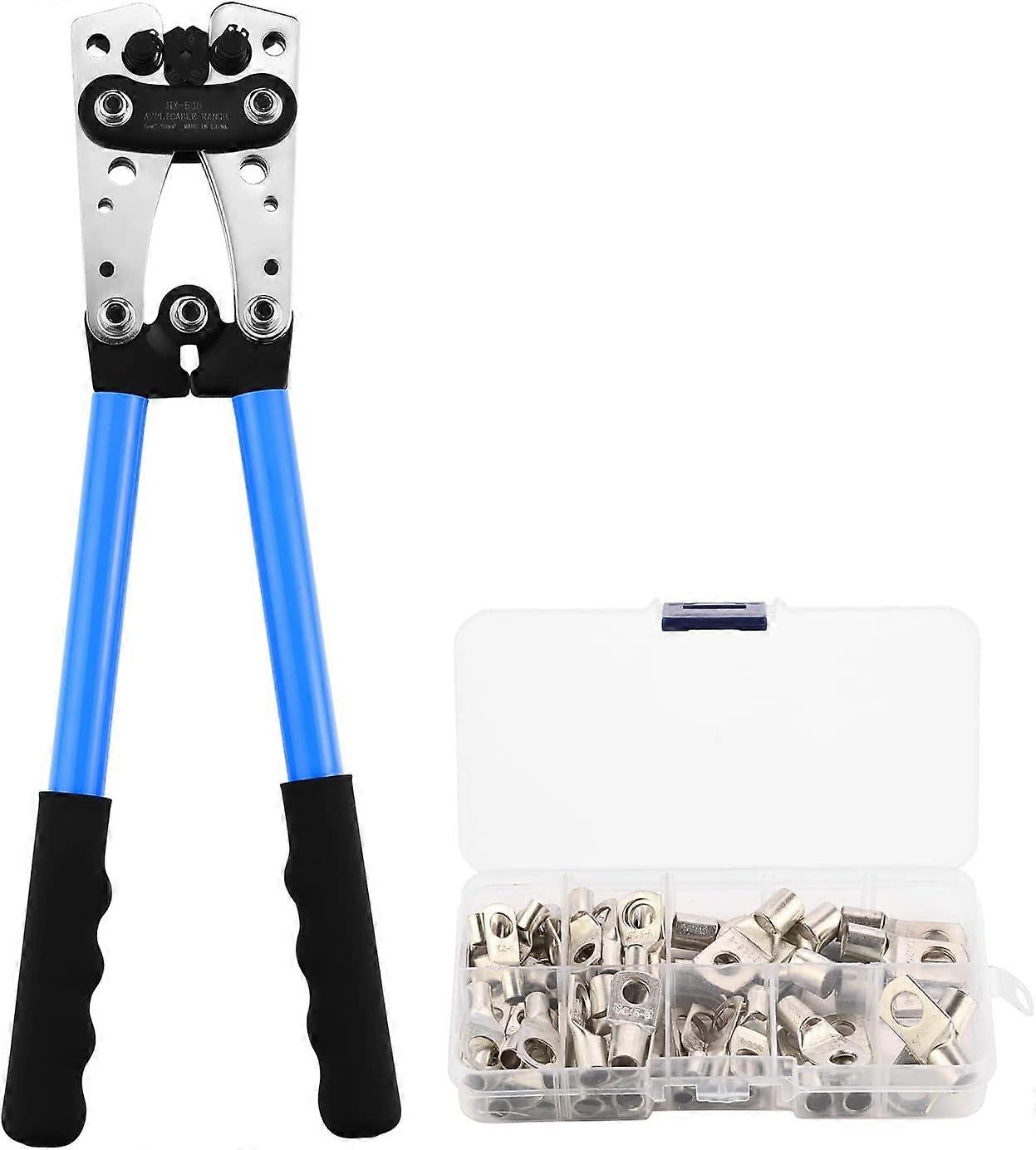 Professional Crimping Pliers KitThis wire crimping tool kit comes with a professional crimping pliers and terminals. for working cable lugs and terminals effortlessly. 6 Setting Lug and Cable CrimperThe battery cable crimper includes 6 dies for battery terminals and cables. 10/8/6/4/2/0 gauge (6mm/10mm/16mm/25mm/35mm/50mm), using rotating heads with a spring loaded locking pin to adjust the size. Excellent QualityThe crimper is made of high carbon steel, durable to use. Precise crimping molds and full lock (mechanical self-locking and unlocking unit) ensure high crimping quality during repeated crimping. Easy to Crimpthe 25cm arm (approx. 25cm) long with non-slip plastic handle and the soft finger prints allow work safety and effortless closing of the pliers Compact hand tool the crimping tool is easy to handle, portable and can be used in narrow places. This tool has wide application in auto electronics work. Product Description Product Description This wire crimping tool kit Comes with a professional crimper and terminals. Easy access to cable lugs and terminals. The material is carefully selected, the workmanship is fine, the product is used for various purposes, and the crimping effect is good, saving money time and effort. Wear-resistant handle design, comfortable to hold and easy to use. Battery cable crimpers include 6 dies for 10/8/6/4/2 gauge terminals and cables /0 (6-50 mm). Parameter overview Standard crimp size 6 AWG AWG 10/8/6/4/2/ 0.6/10/16/25/35/50mm SC6-6(10PCS);SC6-8(10PCS);SC10-6(10PCS);SC10-8(10PCS);SC16 -6(5PCS);SC16-8(5PCS);SC25-6(5PCS);SC25-8(5PCS) step 1 Cut and strip the wire of what you want to crimp step 2 Press the spring die on both sides, rotate the gear to the correct size for the cable and release the spring to lock it Step 3 Select the appropriate terminal, then place it into the wire and press firmly Step 4 If it leaves a ridge, just rotate the connector 90 degrees and crimp it again, which will make the connection tighter