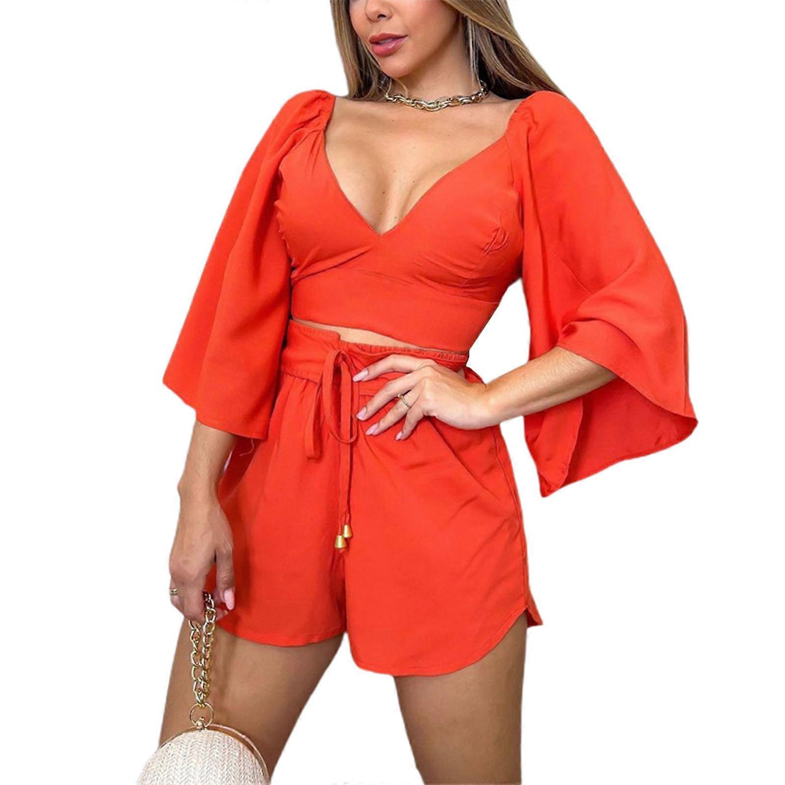 V-neck Backless Flared Sleeve Shirt High Waist Shorts Fashion Casual Suit Solid Color Strappys Shorts Bows Tie Back Suit orange XL