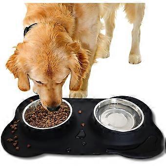 DOUBLE BOWLS DESIGN:Includes a waterproof dog food mat and two dog bowls (38 ounces each), one for water and one for food. It is a good helper when pets are fed, and it can also feed two pets at the same time. . PREMIUM QUALITY:The bottom of the pet feeding bowl is made of silicon material, which is heat-resistant, cold-resistant and durable. The two bowls are made of stainless steel, durable and detachable. This is safer than plastic bowls and really considers the health of pets. . EASY TO CLEAN:The silicone material is dirt-resistant, easy to clean, heat-resistant and cold-resistant. It can be rinsed with a faucet or placed in a dishwasher. The two stainless steel bowls can be disassembled and are oil-free and easy to clean. . NO-SPILL SILICONE MAT:Silicone itself has good anti-slip properties, which can prevent pets from overturning the bowl when eating, and can also prevent the bowl from slipping and scratching on the floor when pets are eating. And with a raised edge design, it can prevent food and liquid from spilling, without worrying about the floor becoming a mess. . EASY TO STORE:The soft silicone pad can be easily rolled up and does not take up space for storage. After the stainless steel bowl is removed, it is a good choice to put it in a cupboard or other place. .
