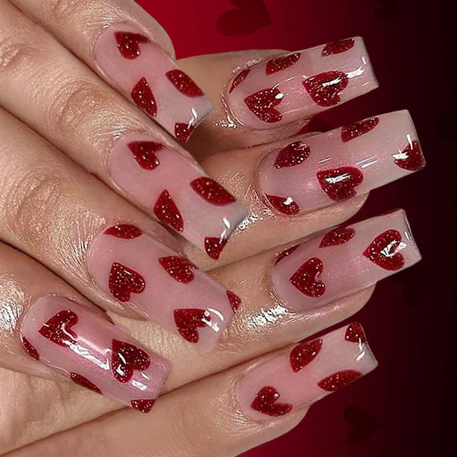 Glossy Red Glitters Heart Design Artificial Nail Medium Length Coffin Style 24Pieces Non Toxic Party Wear Multicolor
