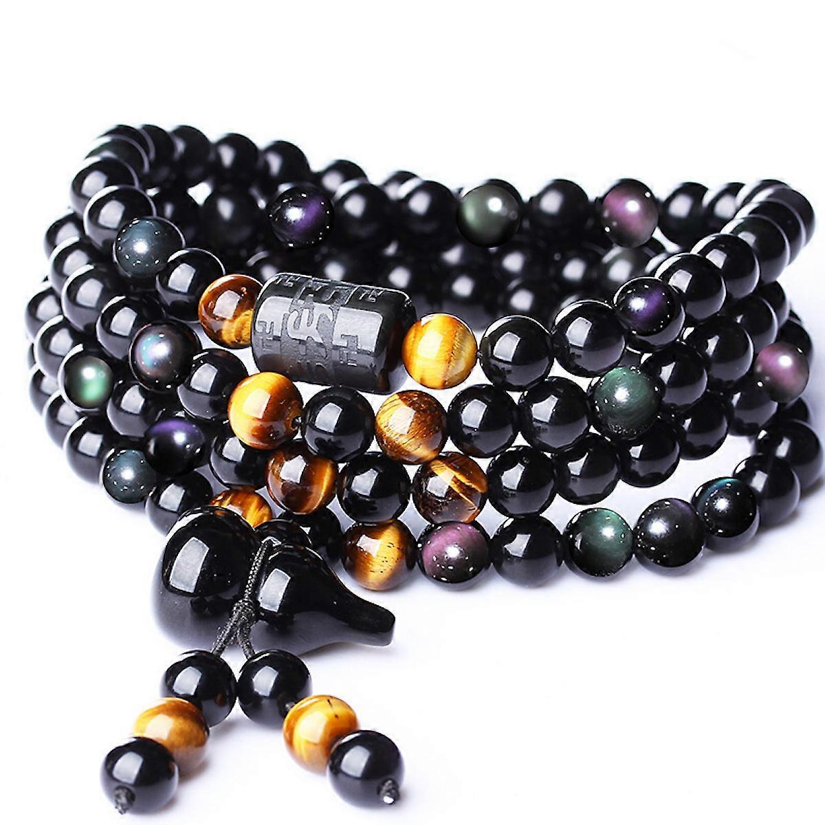 Natural Rainbow Obsidian Bracelet Lucky Charm Buddha Bracelet 108 Round Crystal Beads