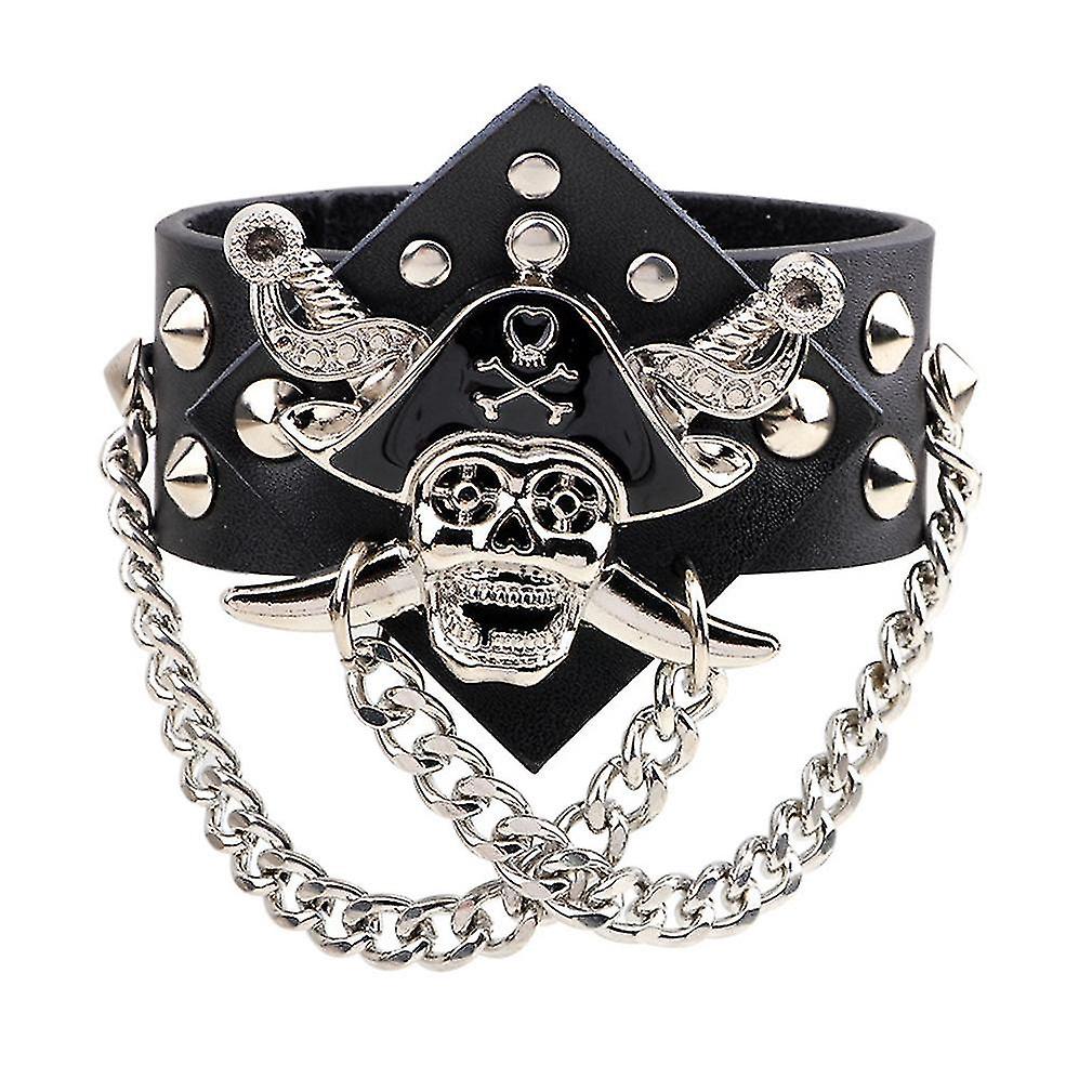 Wide Rivet Punk Leather Bracelet With Caribbean Pirate Accessory