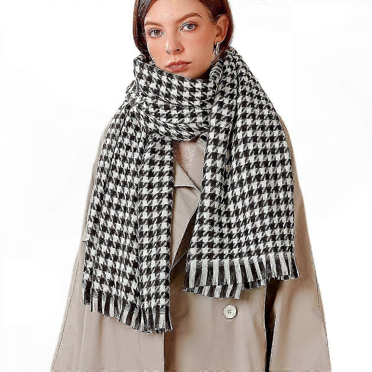 Winter Scarf Soft Cashmere Feel Tartan Plaid Houndstooth Pattern Unisex Gift Black