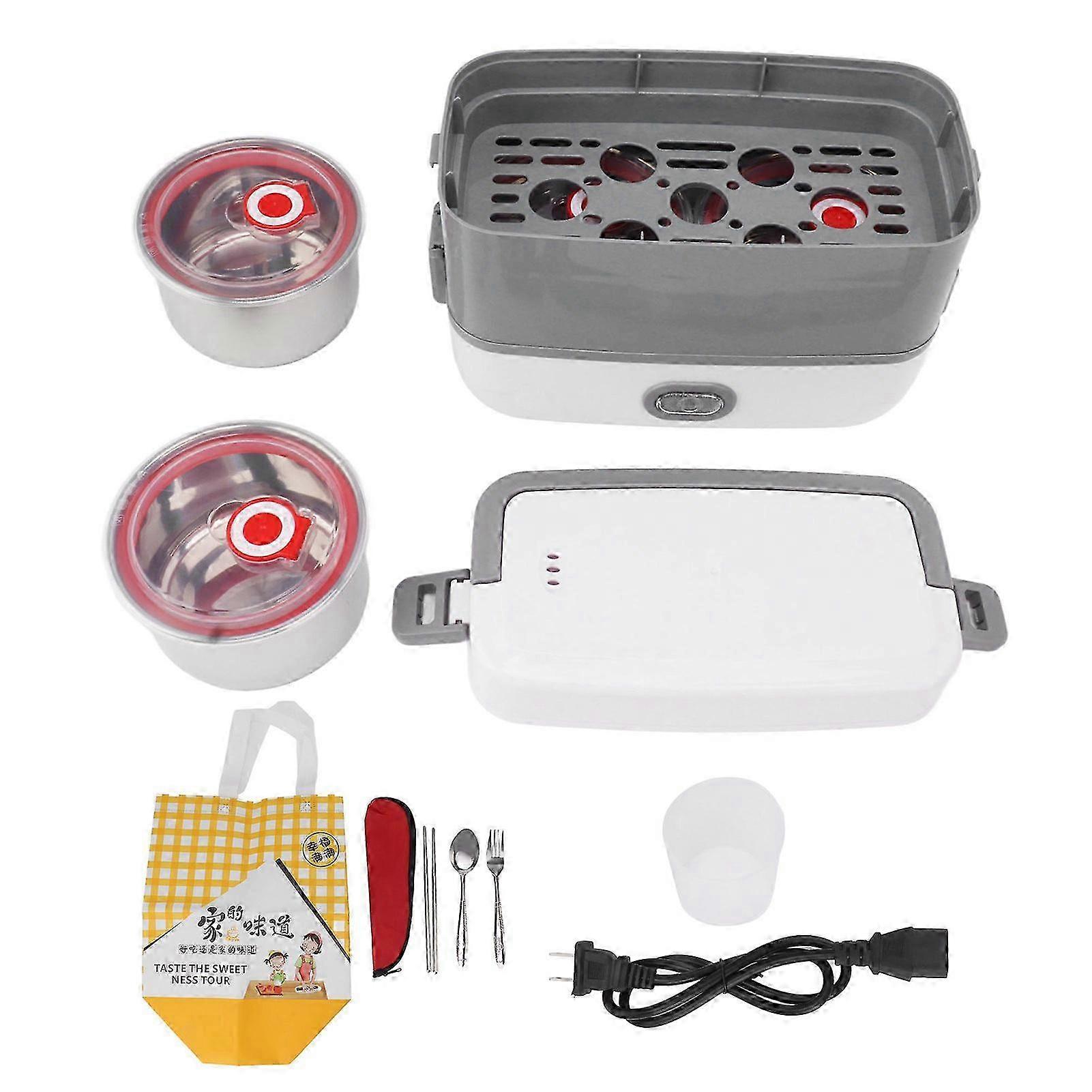 Portable Electric Lunch Box 2 Layers 4 Stainless Steel Insulated Containers Leakproof Heating Lunchbox for Office School Travel Features:<br> 1EASY TO USE: Electric lunch box is plugged in and heated 20 to 40 minutes before a meal so you can enjoy hot homemade food in your office or dorm room. 2EASY TO CLEAN: Heated lunch box features a 304 stainless steel container and inner lid for easy cleaning. The heating base is not waterproof and can only be cleaned with a damp or dry towel. 3LEAKPROOF GASKET: Leakproof heated lunch box lid is fitted with a leakproof gasket for a better sealing and to prevent liquid food from spilling over when bumped. 4MULTIFUNCTION: Portable electric lunch box is multifunctional can steam boil stew raw rice can be cooked into rice. One touch heating keep freshing without fear of letting it cool. 5ANTI DRY BURN: Portable lunch warmer supports anti dry heat safety protection steaming process the lack of water automatically stops working to ensure the safe use.<br> Specification:<br> Item Type: Electric Lunch BoxMaterial: ABS Stainless SteelSingle Inner Liner Capacity: 0.5LGross Weight: 1318g/46.5ozSingle Inner Liner Size: Approx. 110x65mm / 4.3x2.6in<br> Package List:<br> 1 x Base1 x Lid1 x Inner Liner1 x Layer Rack1 x Measuring Cup1 x Adapter1 x Lunch Box Storage Bag1 x Cutlery Storage Bag1 Pair x Chopsticks1 x Fork1 x Spoon<br> Note:<br> Please allow some error due to manual measurement.