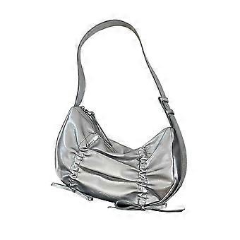 Korean Style Women PU Leather Pleated Underarm Bag Sweet Bowknot Solid Color Shoulder Bag Fashion Small Handbag Purse Silver