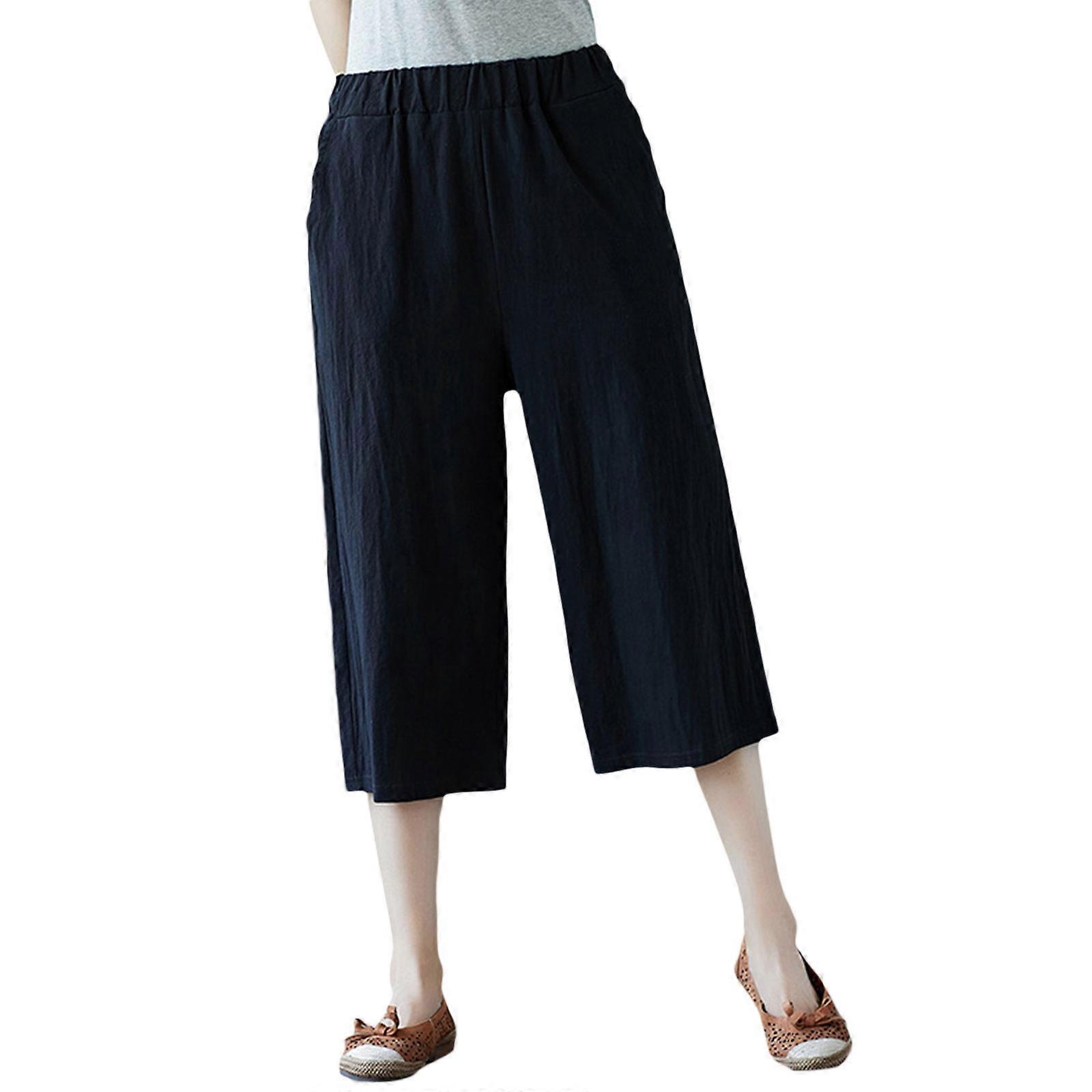 Summer Pants Women's Cotton Pants Wide Leg Elastic Waist Cropped Pants Trousers Black XXL