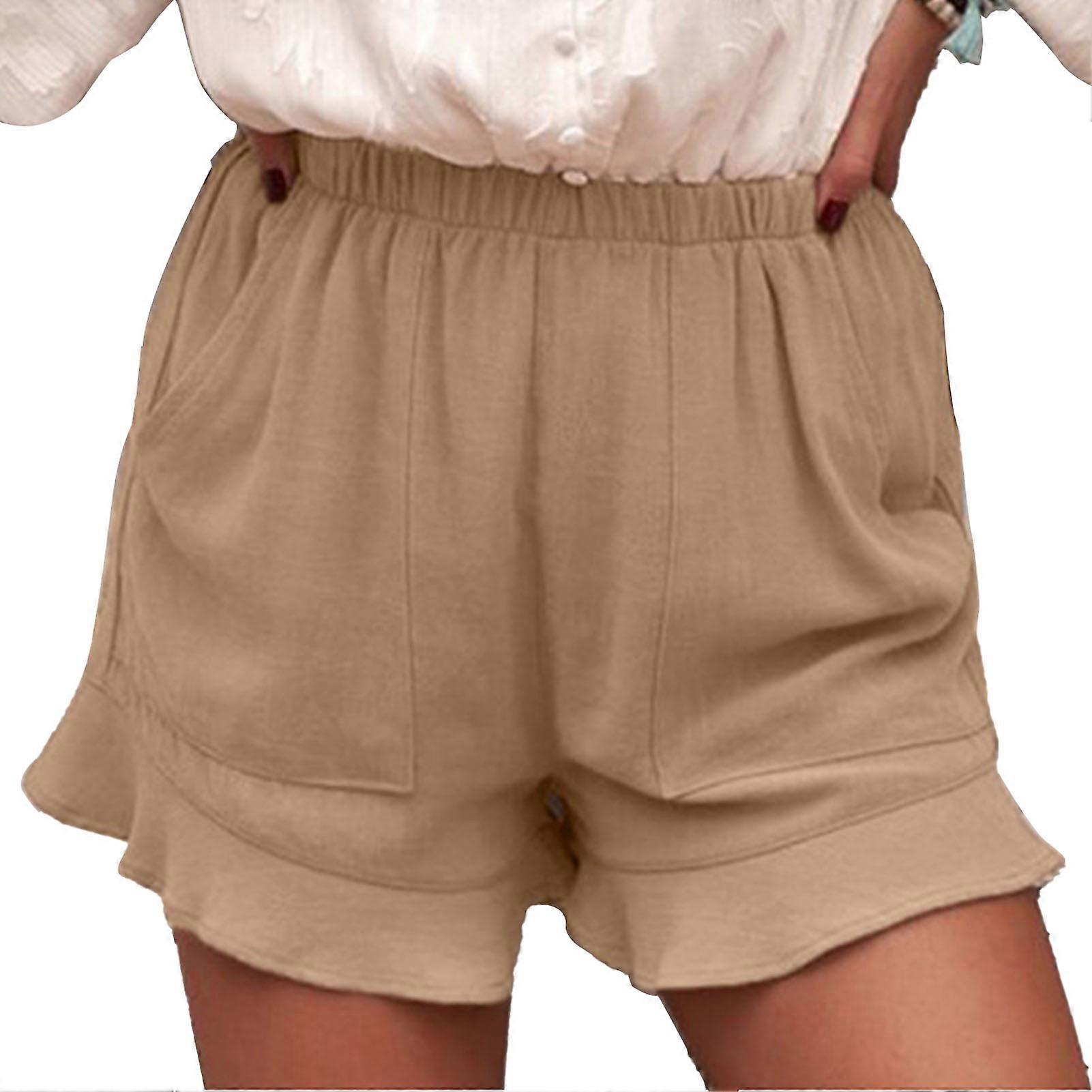 Summer Ruffle Hem Shorts Women Cotton Linen Solid Elastic Waist Casual Shorts with Side Pocket Light Khaki XL