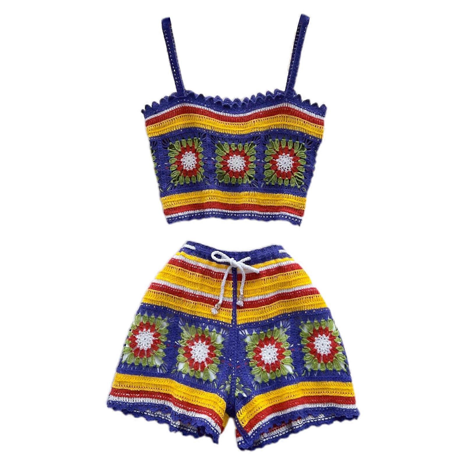 Summer Two Pieces Outfits Women's Sleeveless Camisole High Waist Shorts Crocheted Patchwork Crop Tops Ethnic Style Suits Purple Average code