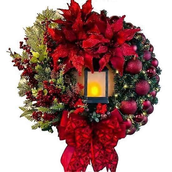 Candle Lamp Front Door Decoration Large Bow & Red Christmas Flower Glowing Wreath Hanging