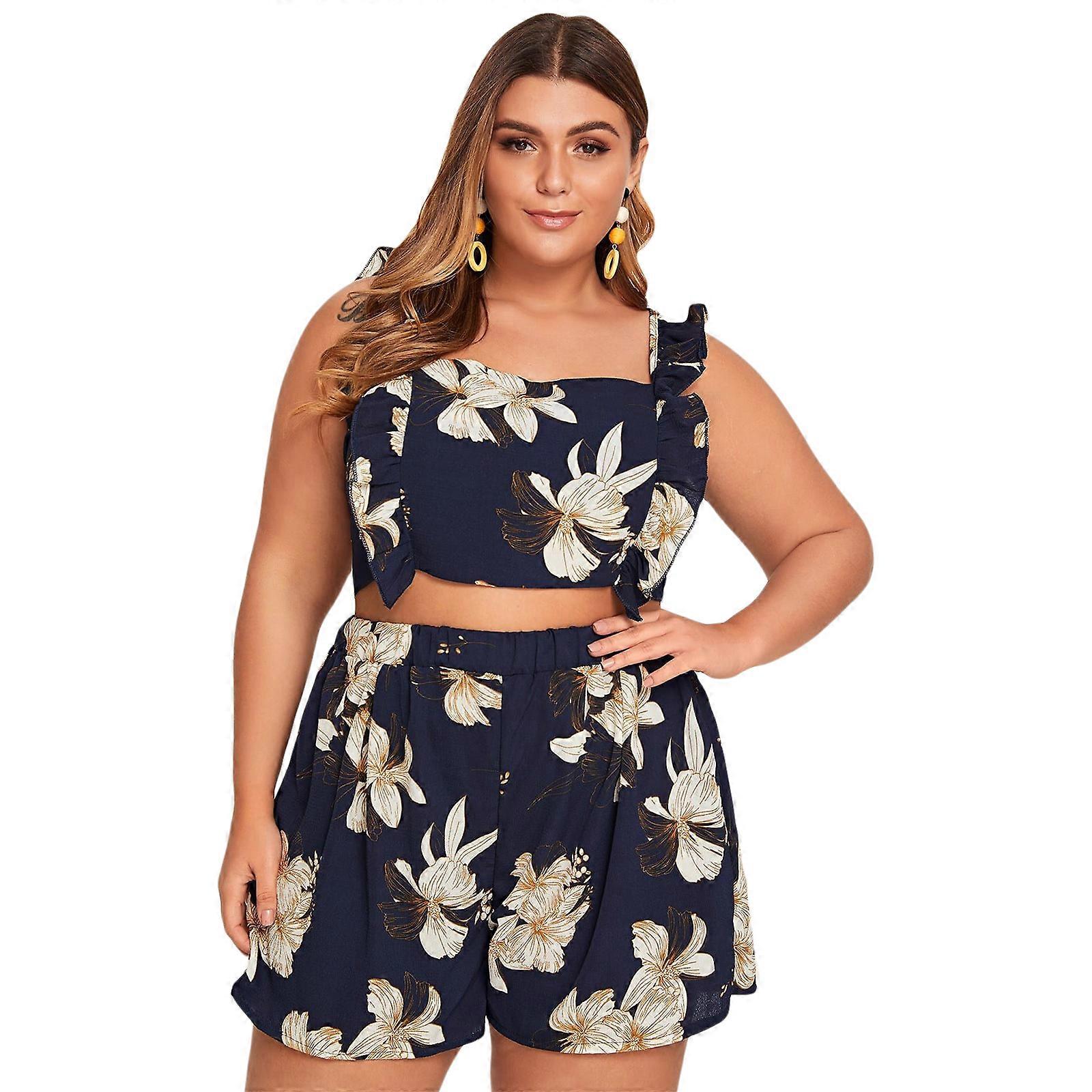 Women's Ruffle Two Pieces Outfit Sleeveless Crop Top and Shorts Stylish Floral Print for Tank Top Plus Size Shorts for P Dark blue XL