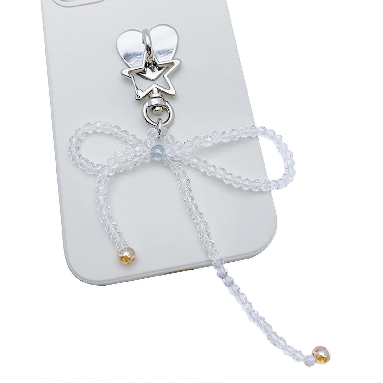 Crystal Beaded Bowknot Hanging Pendant Sweet Cool Phone Strap Bag Decoration Portable Sweet Lanyard for Girls Women White