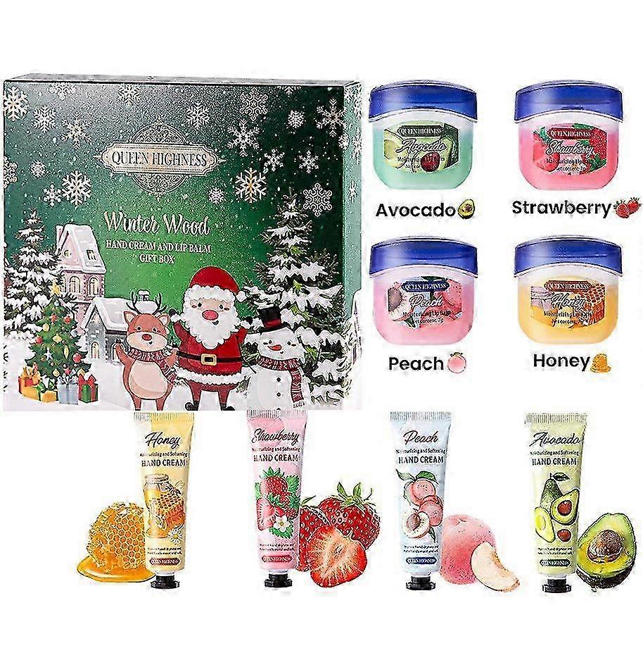 Christmas Heart-Warming Gift Set The Christmas care set contains four hand creams and four lip balms, including avocado, kiwi, strawberry and milk, this delightful gift box meets all your winter needs for lip and hand care. During the cold and dry season, moisturize your loved ones hands and lips, allowing them to enjoy special Christmas moments. Deep-Care Formula The mini Christmas hand cream set contains nourishing ingredients such as glycerin and natural oils that deeply nourish dry hands and reduce roughness and cracking. Lip balm with vitamin E and honey extract moisturizes for a long time and prevents chapped lips, leaving no sticky residue. Suitable for all skin types: The hand cream and lip balm in these small Christmas gifts are free of perfumes and preservatives. This ensures that the skin retains its natural hydration even with frequent washing or in dry environments, ensuring a particularly gentle care. Portable Design Christmas hand cream gift take care of your skin anytime and anywhere. Compact and multifunctional design makes it the perfect companion for your bag. Use it effortlessly at home, in the office or on the go. Happy HolidaysThis hand cream gift set is both a gift for yourself and a thoughtful thought for others. Whether for Christmas, New Year, birthdays or other celebrations, this practical and high-quality gift perfectly conveys your warmest wishes to friends and family.
