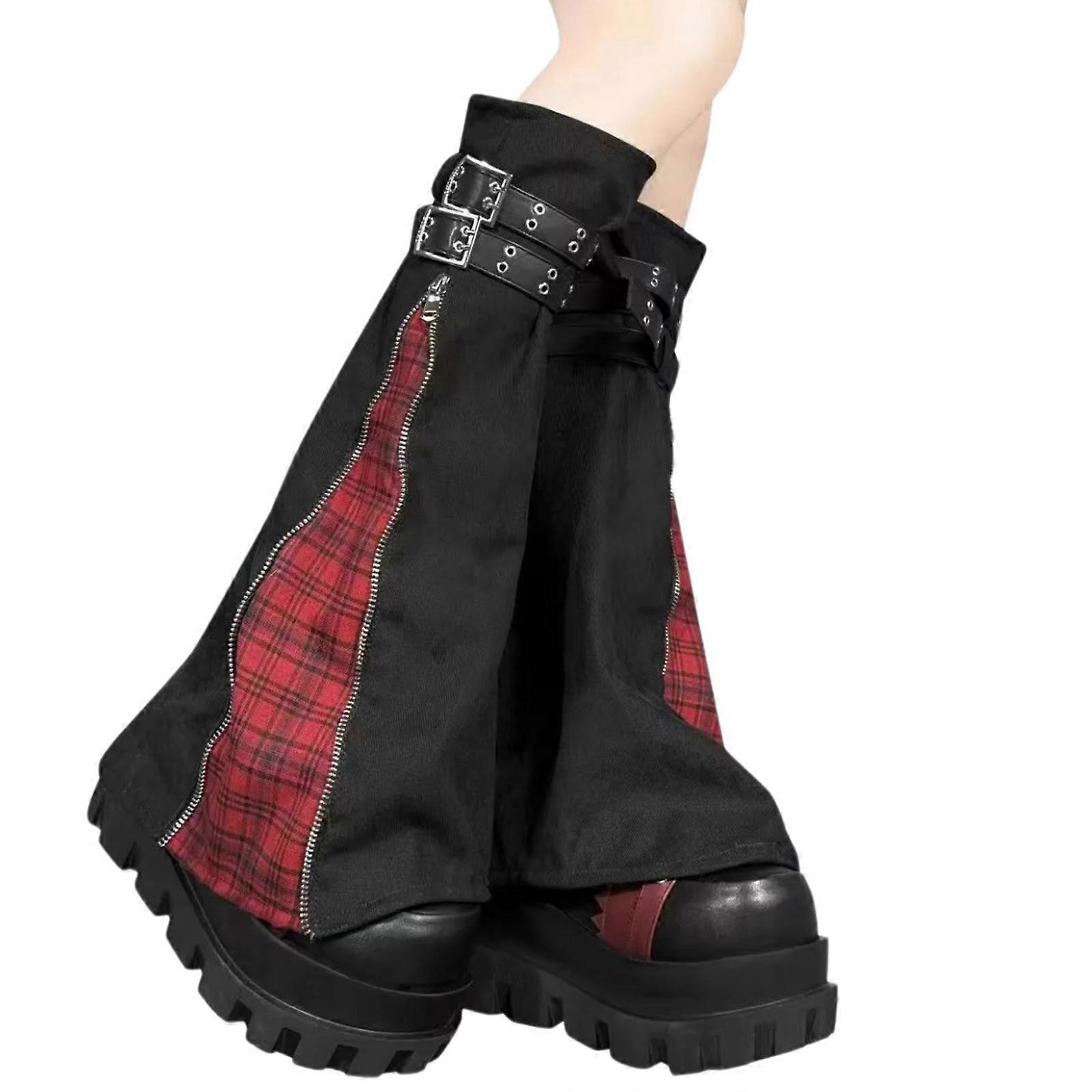 Checkered Zippers Patchwork Leg Gaiters Harajuku Gothic Buckled Belt Flared Leg Warmers Boot Covers Long Socks for Women Black