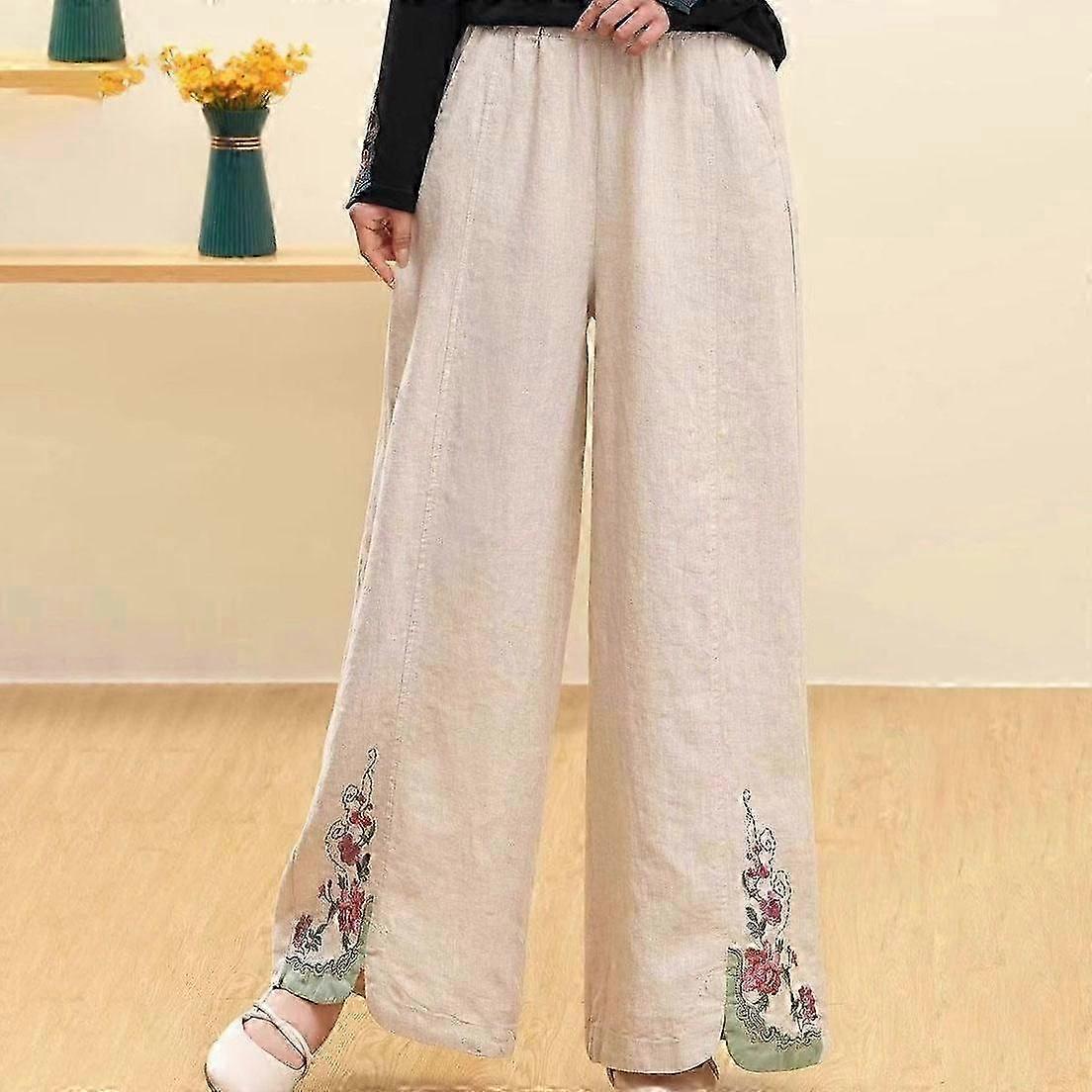 Retro Chinese Style Elastic Waist Loose Cotton Linen Pants with Heavy Embroidered Wide Leg Pants for Women New Arrival