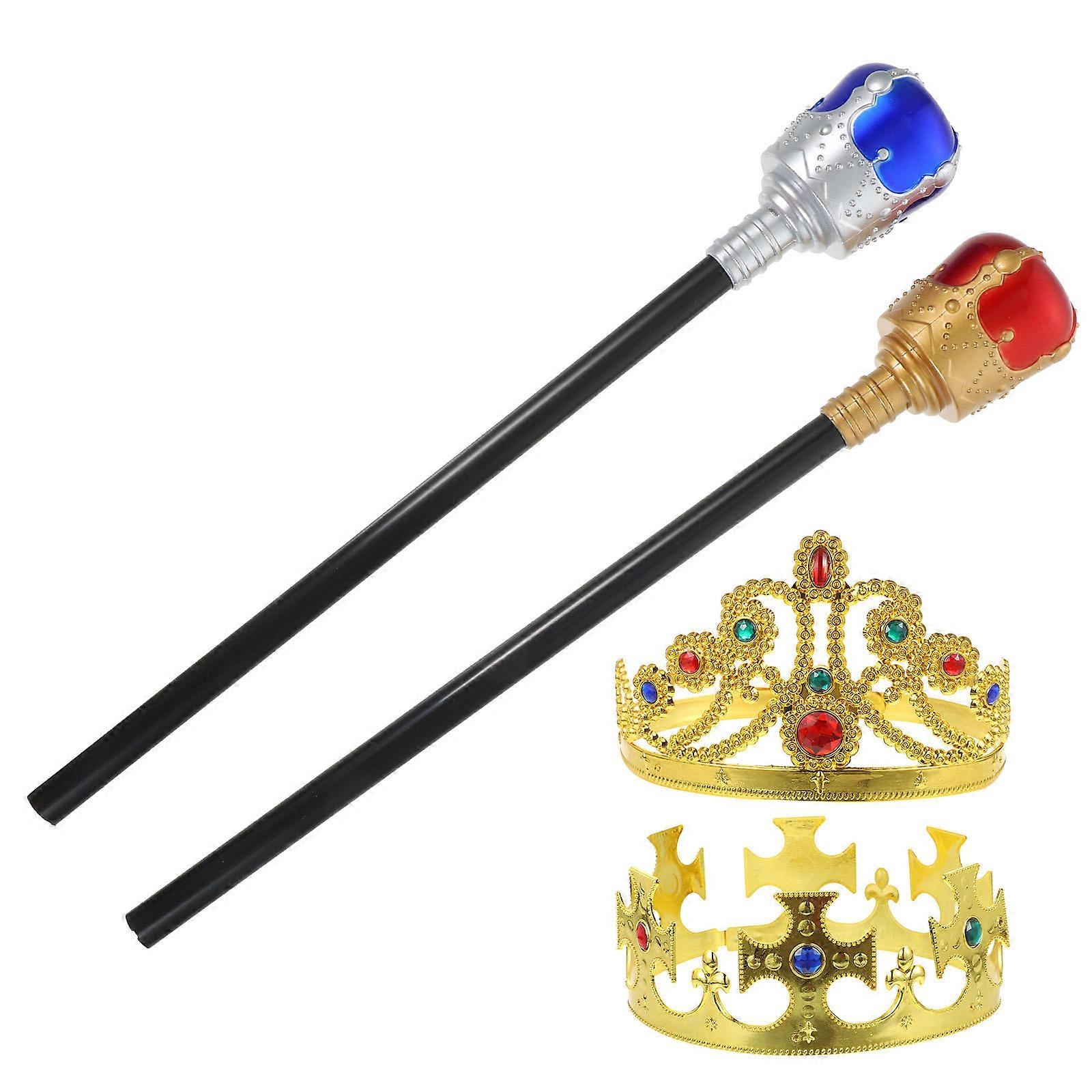 Retro Queen Crown Set with Blue Red Cane Props Medieval Cosplay Hair Accessories for Boys Prince Costume Party Performance Show Supplies