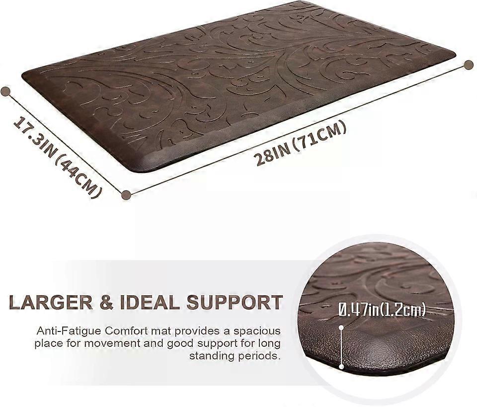 COMFORT: The anti-fatigue mat provides thick, cushioned support to help improve circulation and posture, ensuring comfortable standing while working in the kitchen, suitable for those standing for long periods. SAFE MATERIALS: Made of premium PVC and thick foam, constructed with strong material to maintain shape with extended and heavy use. EASY TO CLEAN SURFACE: Easily cleaned by wiping dirt with a damp cloth or vacuuming as needed; waterproof design ensures long-term durability and superior comfort. ANTI SLIP: Designed with a unique beveled edge, water-resistant top with attractive texture and super non-slip bottom, helping prevent tripping and slipping. MULTI PURPOSE: Available in various sizes, providing extra large activity area in laundry room, kitchen, office or other high-traffic places; neutral color as shown in the picture. NOTE: Open rug fully and place on even, flat, dry floor; water under rug may result in slippage; rug must be placed on dry surface during use.