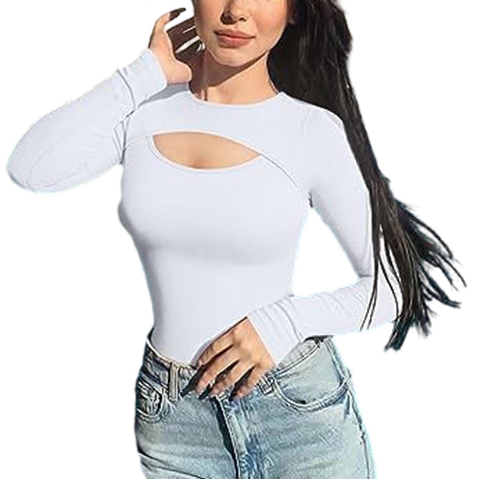 Chic Hollow Out Front Crew Neck Bodysuit Sexy Long Sleeve Jumpsuit for Women and Girls White S