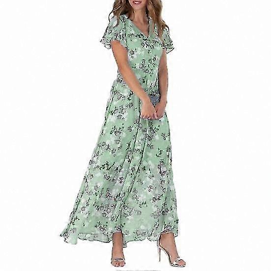 Sweet Floral Print Chiffon Maxi Dress with V-neck Ruffle Sleeves and High-waist Flowy Hem for Women