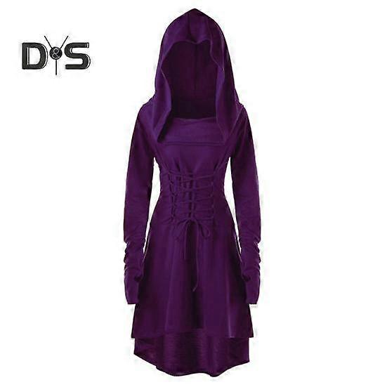 Women Cosplay Dress Gothic Solid Color Lace-up Strap Slim Waist Irregular Hem Hooded Long Sleeves Theme Parties Role-Playing Festival Halloween Midi