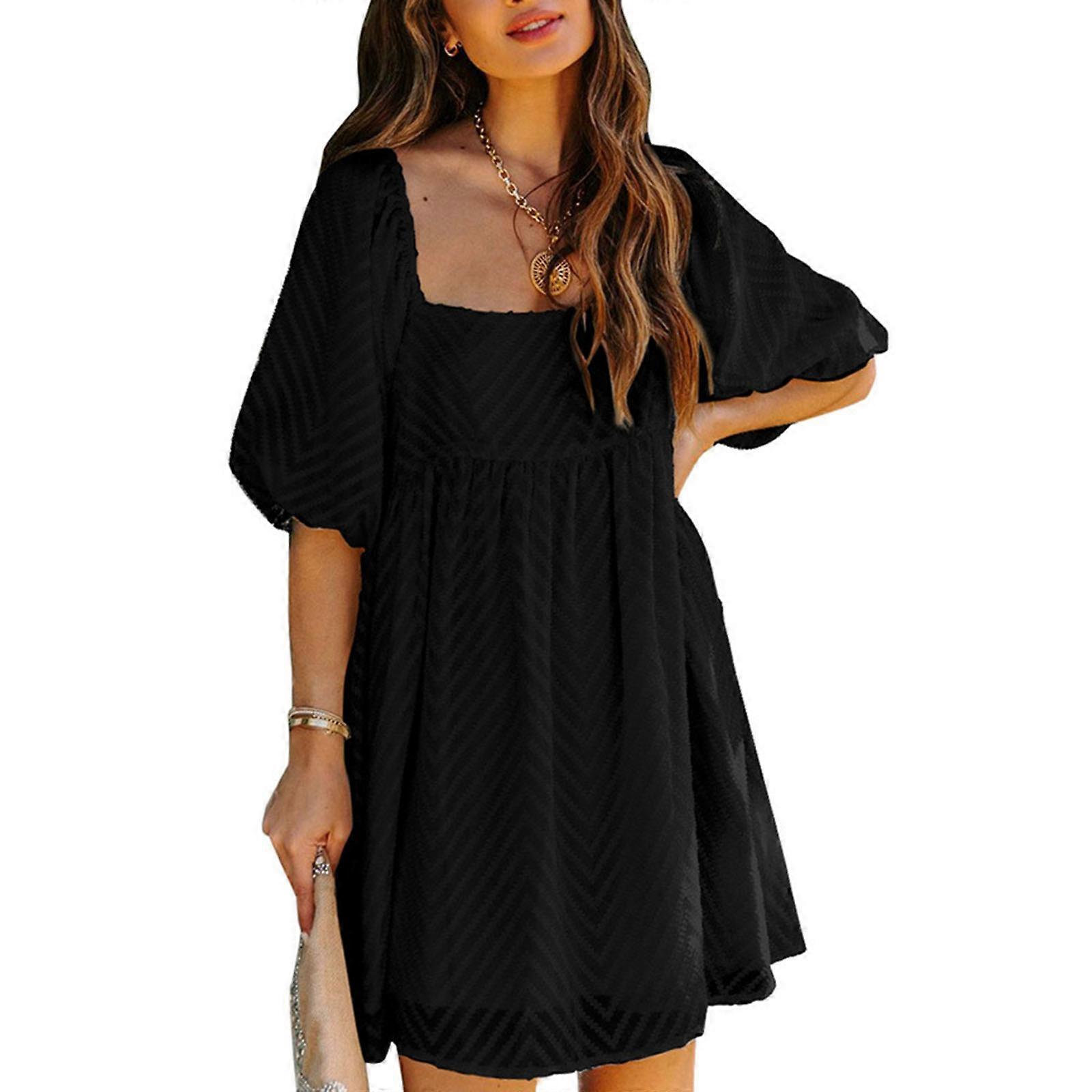 Women Summer Dress Square Neck Lantern Sleeve High Waist Ruffle A-Line Casual Loose Dress for Office Daily Office Black XL