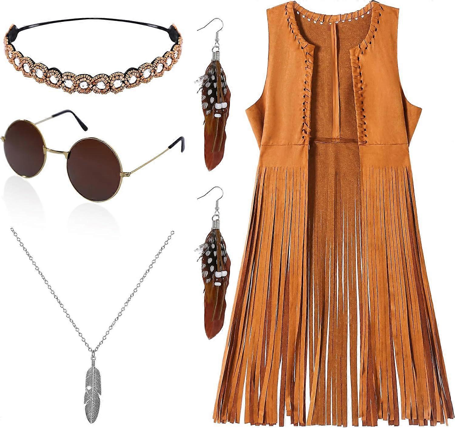 60s 70s Outfits for Women 6Pcs Disco Hippie Costume Clothes Cowgirl 70s Cosplay Tops Women Fringe Vest Accessories
