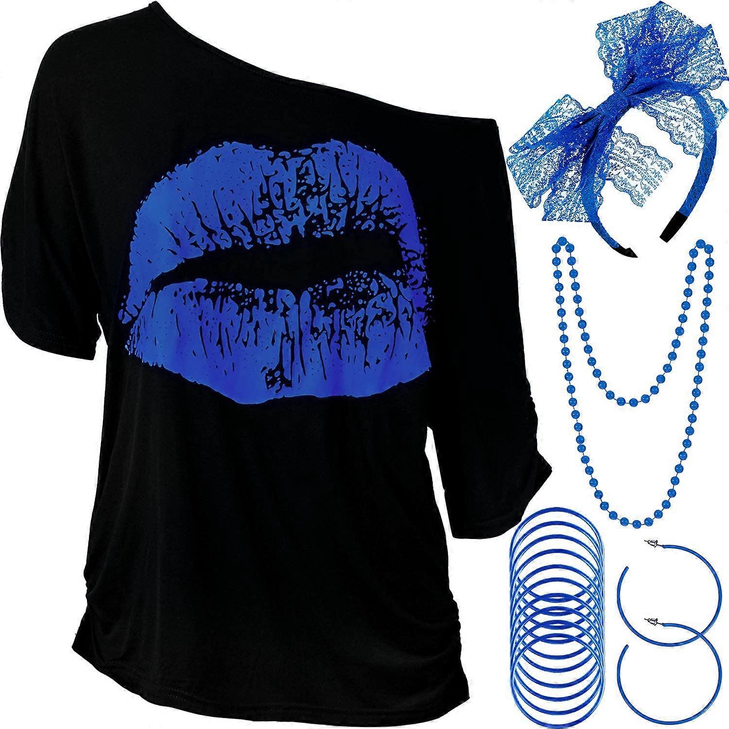 80s Costumes for Women, Lips Print T Shirt Lace Headband Earrings Necklace Bracelet for 80s Theme Party