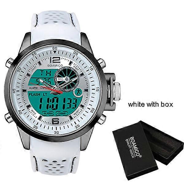 Men Sports Watches BOAMIGO Brand Military Digital Watches Analog LED Quartz Watch 30M Waterproof Wistwatches Relogio Masculino 1. 30m Water Resistant 2.Type: Men sport Watches 3.Movement: dual display 4.Strap Material:rubber 5.Clasp:buckle 6. Showing precise time 7. It is good gift for someone special PARAMETER: -Case Diameter:5.0cm approx-Case Thickne:1.8cm approx-Case Material:Alloy-Band Length:26.5cm approx-Band Material:Rubber-Watch Weight:125gFEATURES:-display hour,minute,second,month,day and week;-daily alarm and chime hourly-snooze-12/24H-1/100second chronograph with split functions-EL backlight what is in package 1 watch WATERPROOF: please do not wear in sauna room or taking hot bath or warm swimming pool,and not allowed to wash hands in hot water Shipment We Ship to Worldwide.We ship your orders within 1-5 busine days after the payment cleared .Items are shipped from China,by Singapore Post or ePacket or China Post Air Mail or Hongkong Post Air Mail, with the tracking number, Most of them will reach destination within 10-25 working days .Delivery time depends on destination and other factors, If you don't receive the item after 30-50 days,please contact us, we'll investigate and solve the delivery problem.PaymentCurrently, you can pay using Visa, MasterCard and bank transfer. You can also pay with selected debit cards including Maestro, Solo, Carte Bleue, PostePay, CartaSi, 4B and Euro6000. More payment options will be available on in the future.Return/RefundWe will do our best to satisfy our customers.We will refund you if you return the items within 7 days from your receipt of the items for any reason . However , the buyer should make sure that the items returned are in their original conditions . If the items are damaged or lost when they are returned, the buyer will be responsible for such damage or lo , and we will not give the buyer a full refund.The buyer should try to file a claim with the logistic company to recover the cost of damage or lo .The buyer will be responsible for the shipping fees to return the item.We are sure there have no broken products when you receive your package,if there have some defects,please kindly send pictures to me ,we will refund money to you after confirmation.All returned items MUST BE in the original packaging and you MUST PROVIDE us with the shipping tracking number, specific reason for the return.We will refund YOUR FULL WINNING BID AMOUNT, upon receipt of the item in its original condition and packaging with all components and acceories included, AFTER BOTH Buyer and seller cancel the transaction from aliexpre. Or you may choose to have a replacement.Size or fit iues:The sizes are illustrated with specific measurements in the detail.specifications . Please check the specifications before You place an order . Normally the allowable differences in the size are approximately 0.5 inch in measurement . If you find the size of the products do not fit you , You can directly contact us.Color Mismatch:Differences in color may be caused by some other reasons such as color reflection in the monitor,lighting, background etc . However , if you believe that the item received is in wrong color , please contact us to see if a return or refund is poible .If you have any question. please leave meage and your email addre,then we will contact with you,welcome to visit our store!