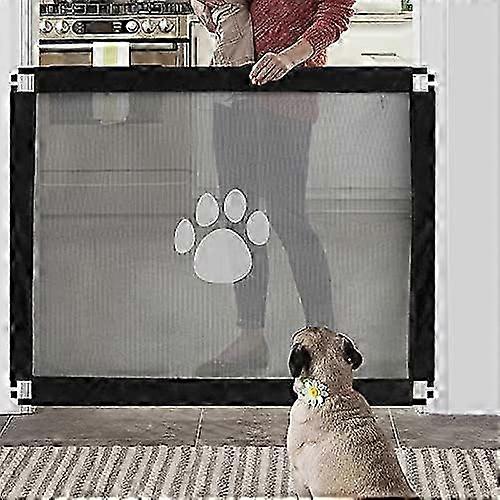 Perfect for Pets: Dog gates can keep your pets in a certain area and avoid pets disturbing you while you work or clean your house.Suitable for dogs, old cats, rabbits and other pets.The product is not indestructible and is not suitable for aggressive chewers.Easy to assemble: Install according to the detailed instructions, insert the connected tubes into the inner edge of the nylon fabric to build the door frame, and then use the brackets to attach the door to the wall/door frame.The dog door can be easily dismantled and stored to save space.The product is improved several times: 1. The plastic pipe is improved into a hollow iron pipe, which is more durable. 2. The package contains two attachment methods.You can choose whether to punch holes or stick on the wall. 3. The surface of nylon is thicker and can resist scratching by pet claws.Install Anywhere: Pet gates can be used to separate hallways, kitchens, bedrooms, stairs;They can prevent dogs from damaging furniture, sofas or misbehaving.Although a pet safety gate is installed, you can clearly monitor pets' activities through the nylon net.Size: Length: 100cm, Height: 80cm, suitable for most front door sizes.The dog door is lightweight and sturdy and will not harm your pet.It is recommended to install three brackets, two self-adhesive brackets on the closed side and one on top of the open side, so that the door can be opened or closed more conveniently.