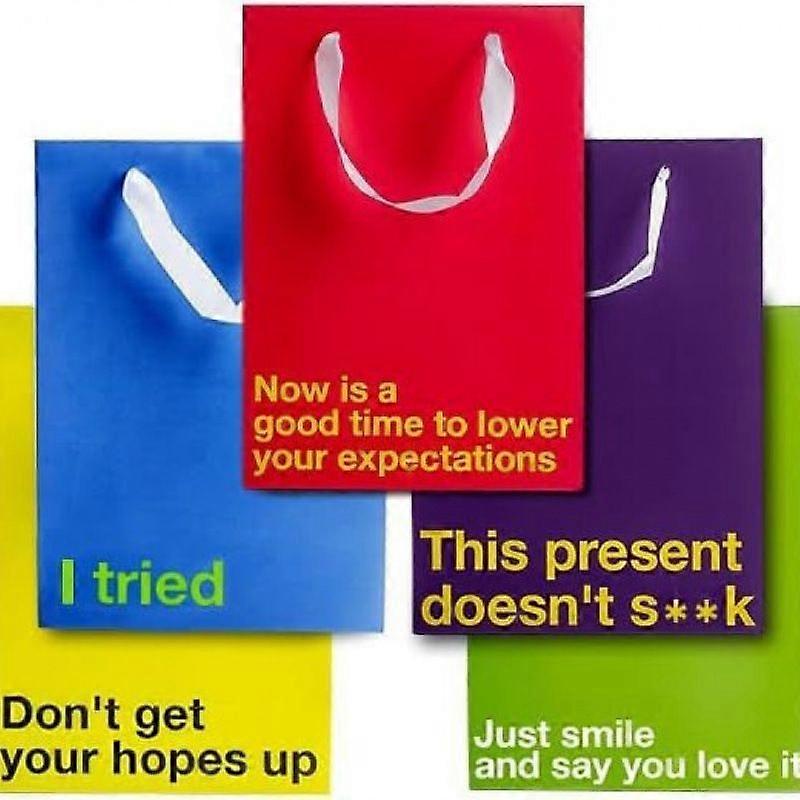 MilkToast Brands Funny Gift Bags, 11" x 8" x 4" Size, Set of 5 Colored Kraft Paper Bags with Sarcastic Phrases for White Elephant Gifts, Christmas, Bi