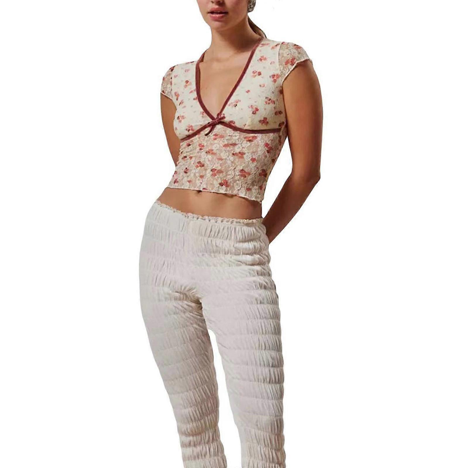 Womens Short Cap Sleeve 90s Vintage Floral Lace T-Shirts Summer Sexy V-Neck Bowknot Slim Fitted Crop Top Streetwear Color XL
