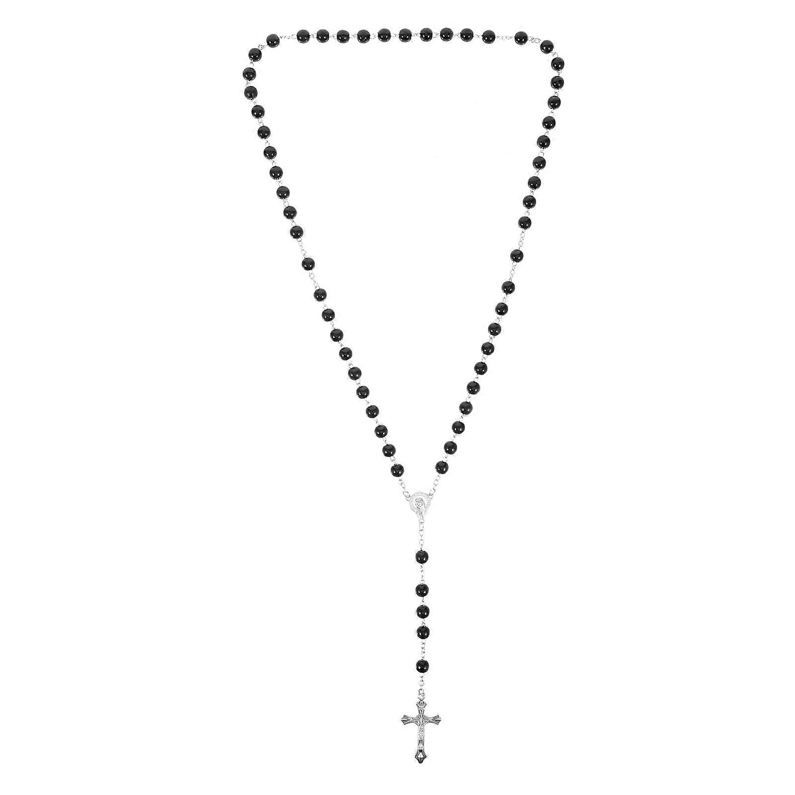 Black Rosary Necklace Jesus Cross Pendant Glass Pearl Necklace 3Pcs for Decor