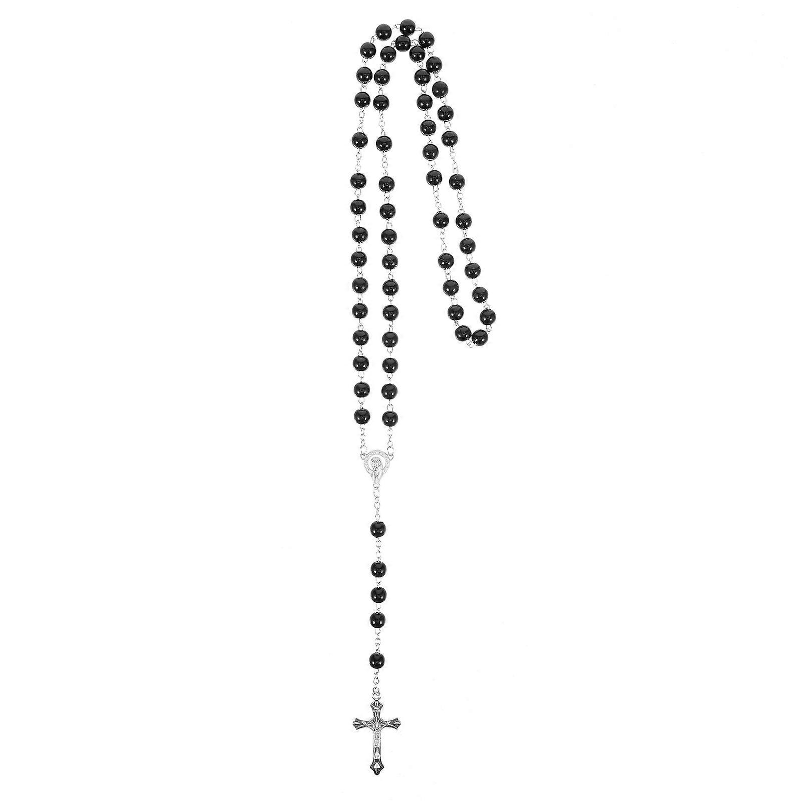 Rosary Necklace Jesus Cross Pendant Necklace Black Glass Pearl 3Pcs