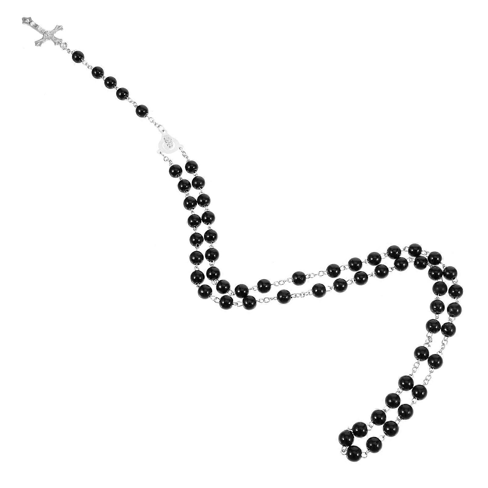 Black Glass Pearl Rosary Necklace Jesus Cross Pendant Necklace 3Pcs
