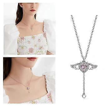 Rhinestone Mounted Necklace Pink Love Heart Angel Wings Pendant Clavicle Chain Womens Jewelry Gifts