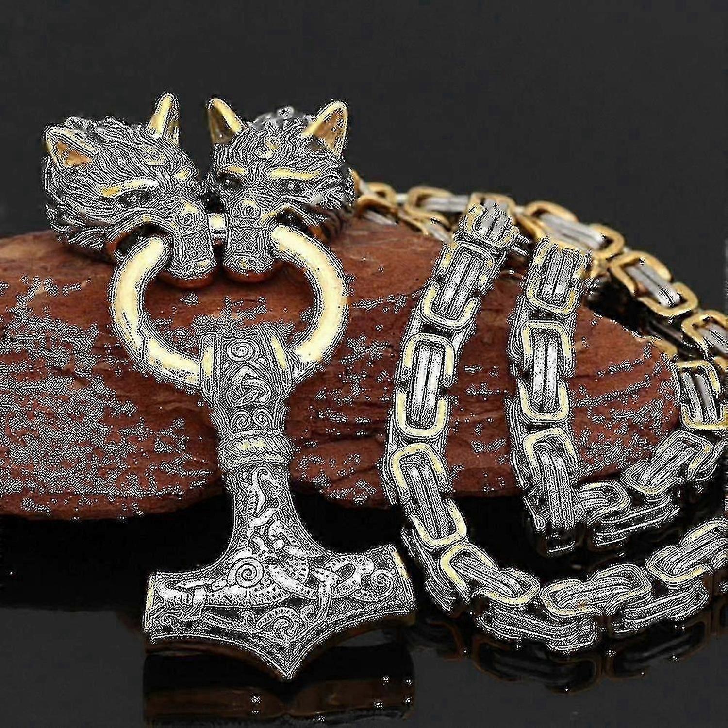 Viking Wolf Head Thor's Hammer Pendant Necklace in Stainless Steel with Leather Chain for Men