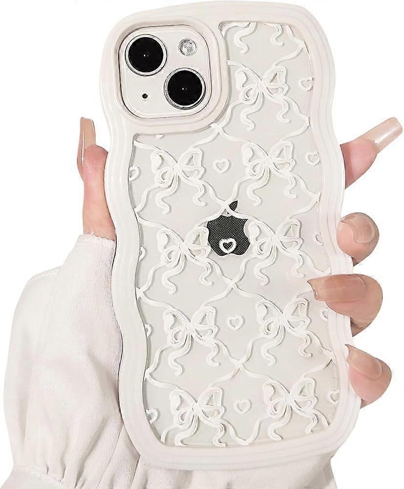 Compatible for iPhone 14 Case Cute Clear Wavy Frame for Women Girl Bow Knot Pattern Curly Shape Shockproof Soft TPU 2 in 1 Phone Cover White Bow