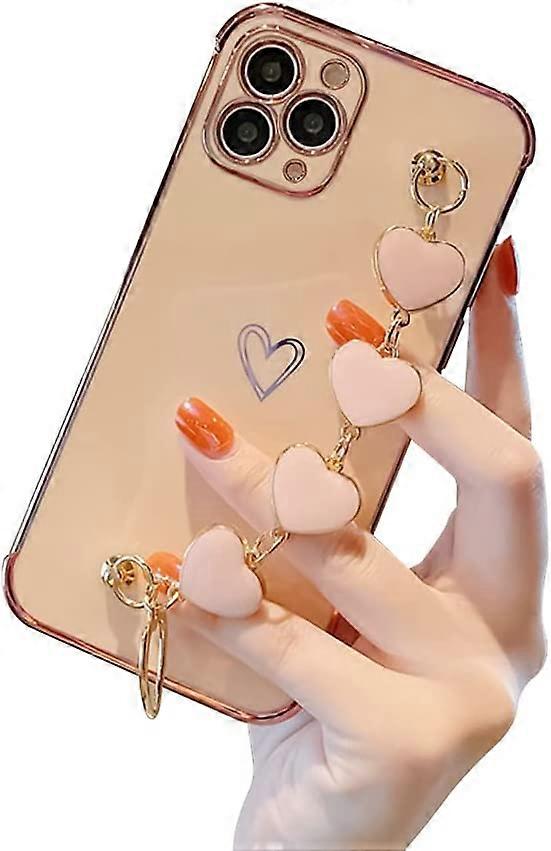 Compatible with iPhone 11 Pro Max Case, Cute Love Heart Pattern for Women Girls with Heart Chain Wrist Strap Bracelet Soft Glossy Plating TPU Cover fo