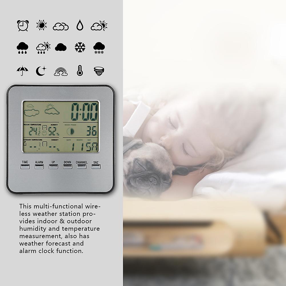 Wireless Weather Station Clock Thermometer Hygrometer Silver 13x13x2cm