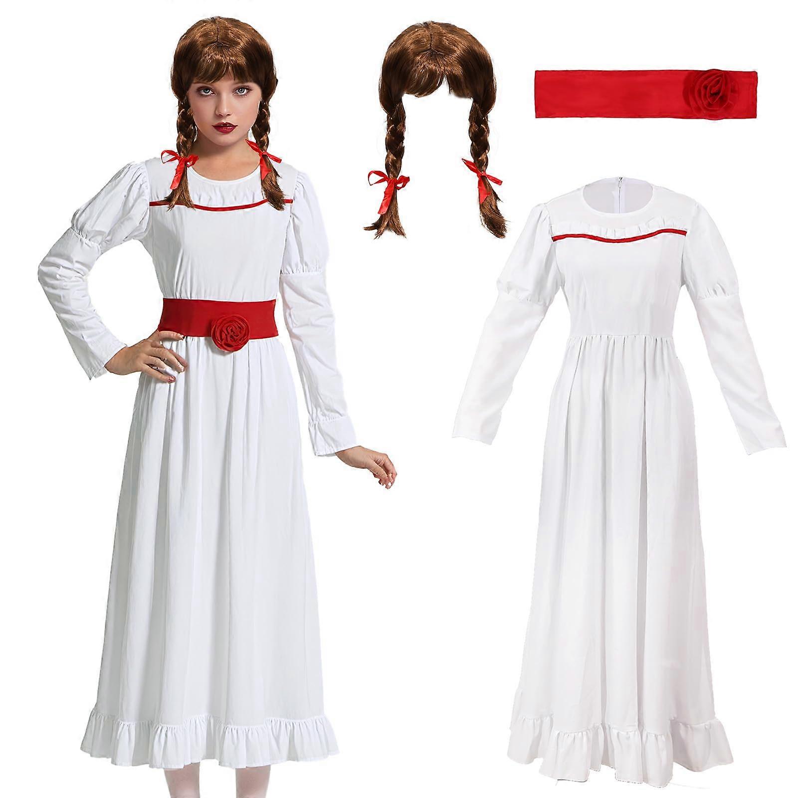 Halloween Scary Annabelle Costume Horror Movie White Dress Braided Wig Waistband Creepy Cosplay Costume for Women Adult