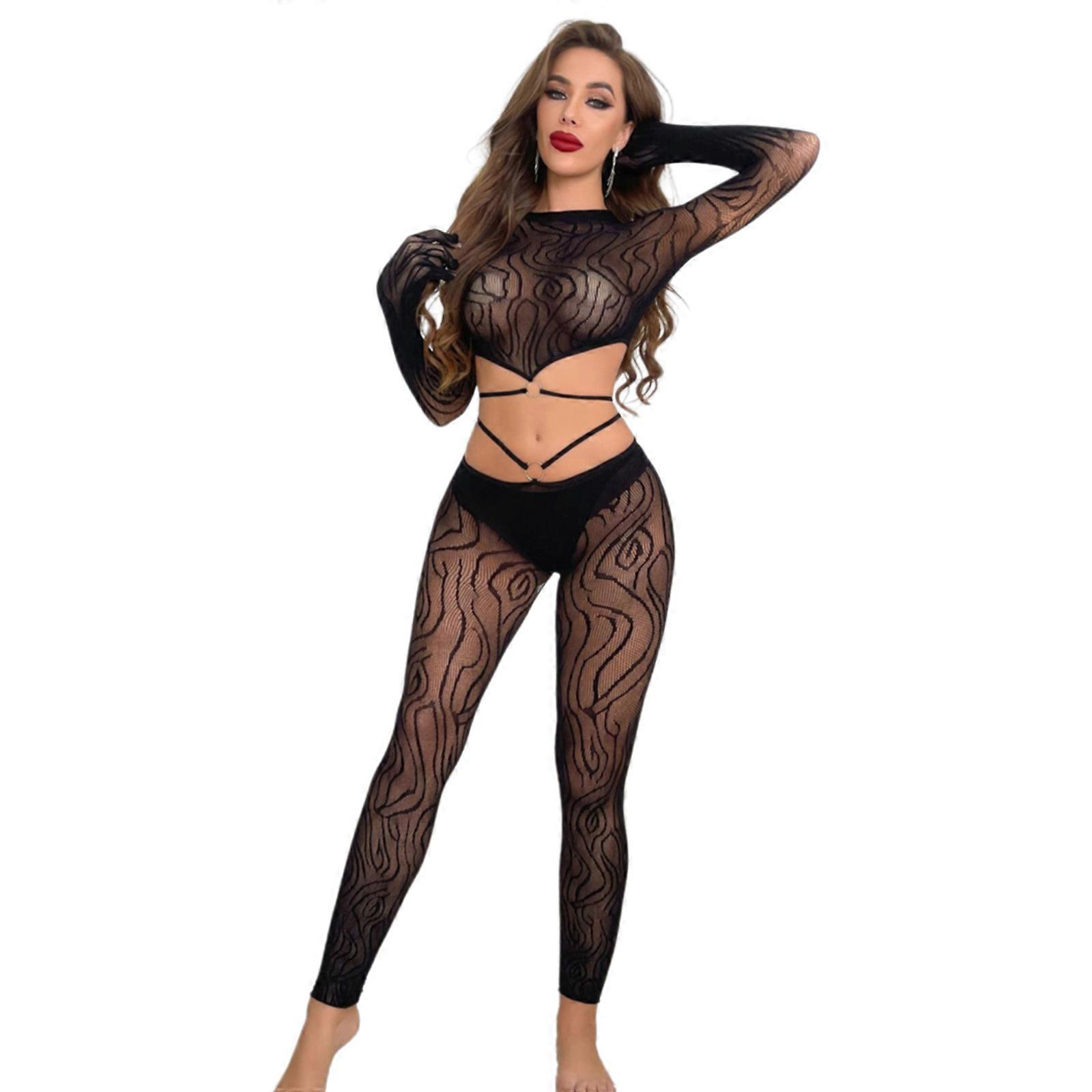 Feminine Lace Accented Body Hugging Catsuit with Strap Sheer Bodystocking Fishnet Jumpsuit Stretchy Romper for Women Black