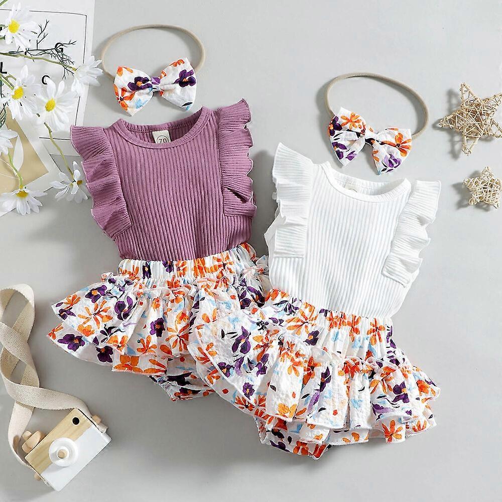Infant Girls Sleeveless Ribbed Romper Bodysuits Ruffles Floral Printed Shorts
